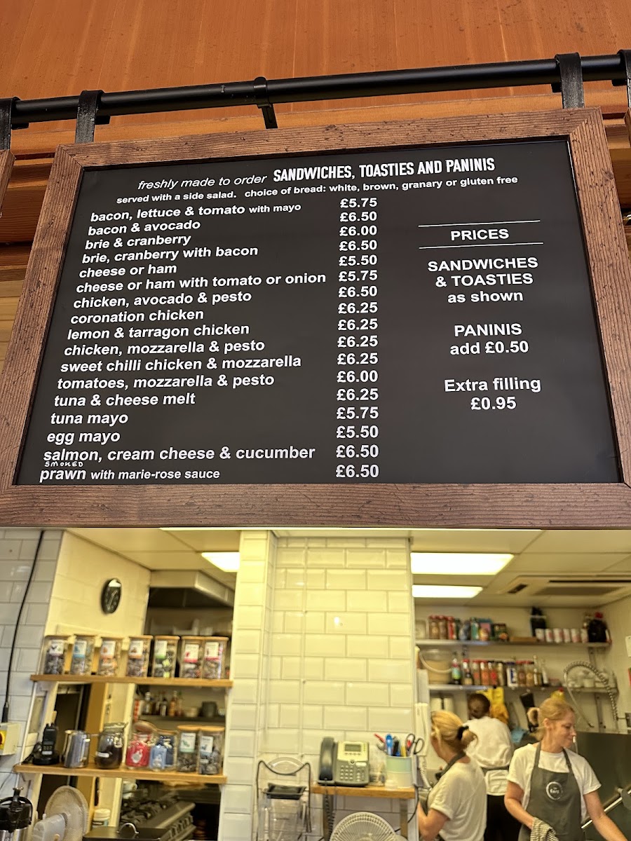 Food options are primarily focused on sandwiches and light bites, with selections such as Bacon, Lettuce & Tomato; Coronation Chicken; Tuna & Cheese Melt; and Egg Mayo. This wide selection allows for quick ordering and casual dining, suitable for visitors seeking a light meal or snack alongside tea or coffee.